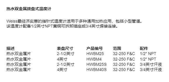 WEISS 热水双金属拨盘式温度计HW5A2系列